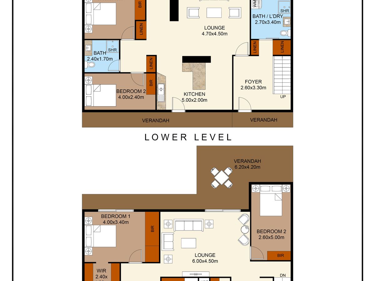 Downstairs consists of a large living space overlooking the water, 2 good-sized bedrooms, a full-size kitchen and a bathroom. The main entry links both residences plus provides access to the large laundry and the third “beach bathroom”.